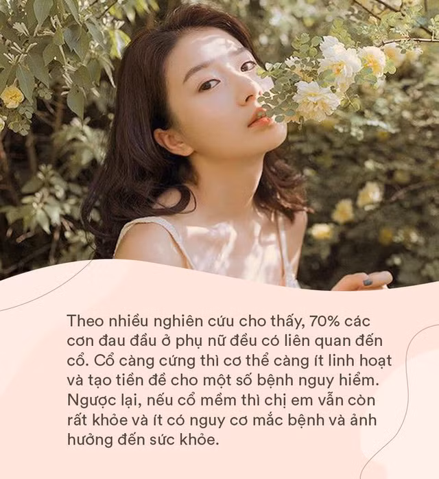 Theo nhiều nghiên cứu cho thấy, 70% các cơn đau đầu ở phụ nữ đều có liên quan đến cổ. Cổ càng cứng thì cơ thể càng ít linh hoạt và tạo tiền đề cho một số bệnh nguy hiểm. Ngược lại, nếu cổ mềm thì chị em vẫn còn rất khỏe và ít có nguy cơ mắc bệnh và ảnh hưởng đến sức khỏe.