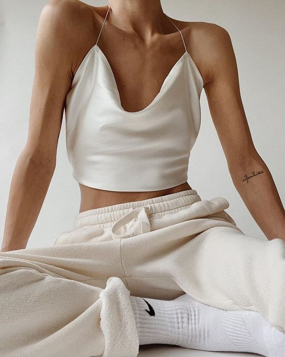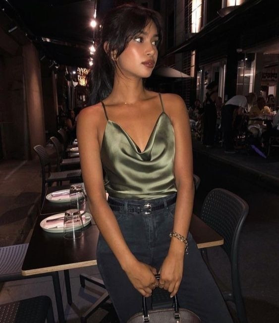 | 4. Áo hai dây chất liệu satin: Áo hai dây được làm từ chất liệu satin bóng bẩy được dàn hot girl "lăng xê" nhiệt tình. Có khá nhiều lựa chọn khi mua thiết kế này bởi sự đa dạng về kiểu dáng, từ cổ đổ, cổ ngang, crop top tới yếm. Ảnh: Na Nin Vintage, @modedamour. |