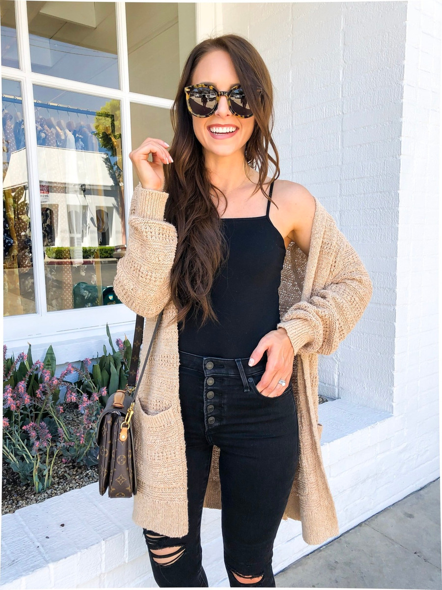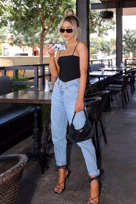 | 5. Bodysuit: Bodysuit mang thiết kế tương đồng với đồ bơi. Nhờ vậy, mẫu áo này có tác dụng làm tôn lên vóc dáng của người mặc. Bodysuit đen, quần jeans cạp cao cùng túi kẹp nách cũng là công thức phối đồ đáng thử. Nếu muốn kín đáo hơn, mọi người có thể khoác thêm cardigan bên ngoài giống bạn nữ ở hình trái. Ảnh: Pinterest, Daryl-ann Denner. |