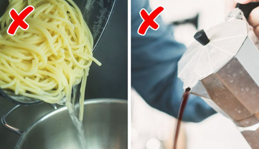Bã cà phê đổ vào bồn rửa thường gây tắc nghẽn cống. Điều tương tự cũng xảy ra với nước còn sót lại sau khi nấu mì ống hoặc gạo. Bạn có thể nhanh chóng làm sạch bát, đĩa nhưng lại làm tăng nguy cơ tắc nghẽn cống.