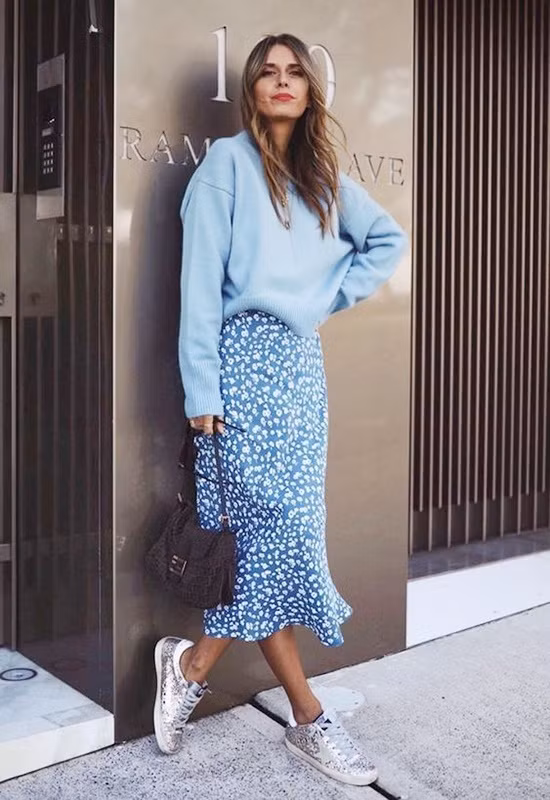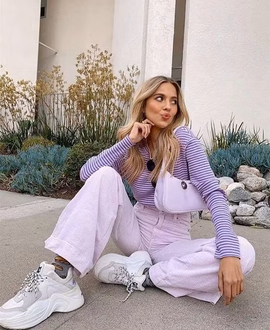 Các gam pastel xinh xắn có thể thắp sáng diện mạo phái đẹp. Bên cạnh đó, cách mix cùng giày sneaker năng động sẽ cân bằng tổng thể, giúp nàng bớt "bánh bèo".