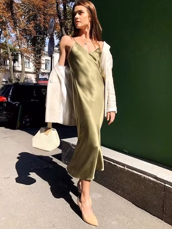 Đầm satin + áo khoác mỏng + giày mũi nhọn