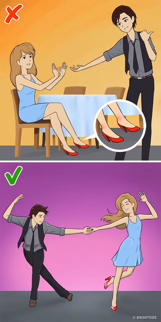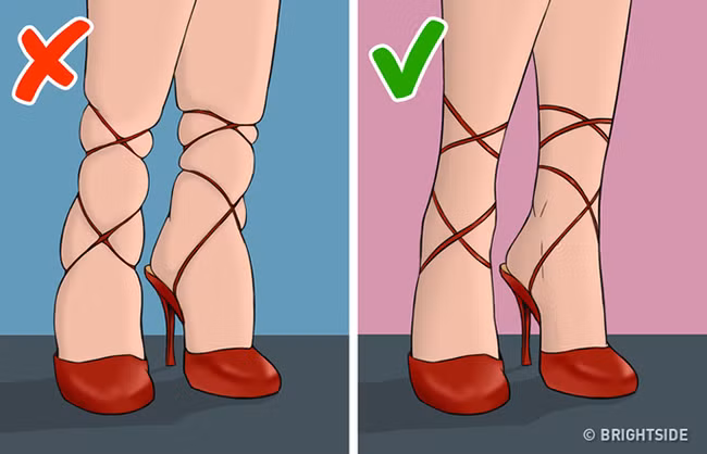 Đi giày cao gót giúp tôn lên vóc dáng của người phụ nữ. Tuy nhiên, nếu đi loại giày này thường xuyên, nó có thể làm hại đến vóc dáng và sức khỏe của bạn. Phụ nữ thường cảm thấy mệt mỏi khi đi giày cao gót vì sự phân bố trọng lượng cơ thể kém, trọng lượng dồn cả vào gót chân. Sau một ngày dài đi giày cao gót, bạn có thể cảm thấy đau mỏi ở chân. Vậy thì tại sao khi về nhà bạn không bỏ giày ra, nhấc chân lên tường và thư giãn.