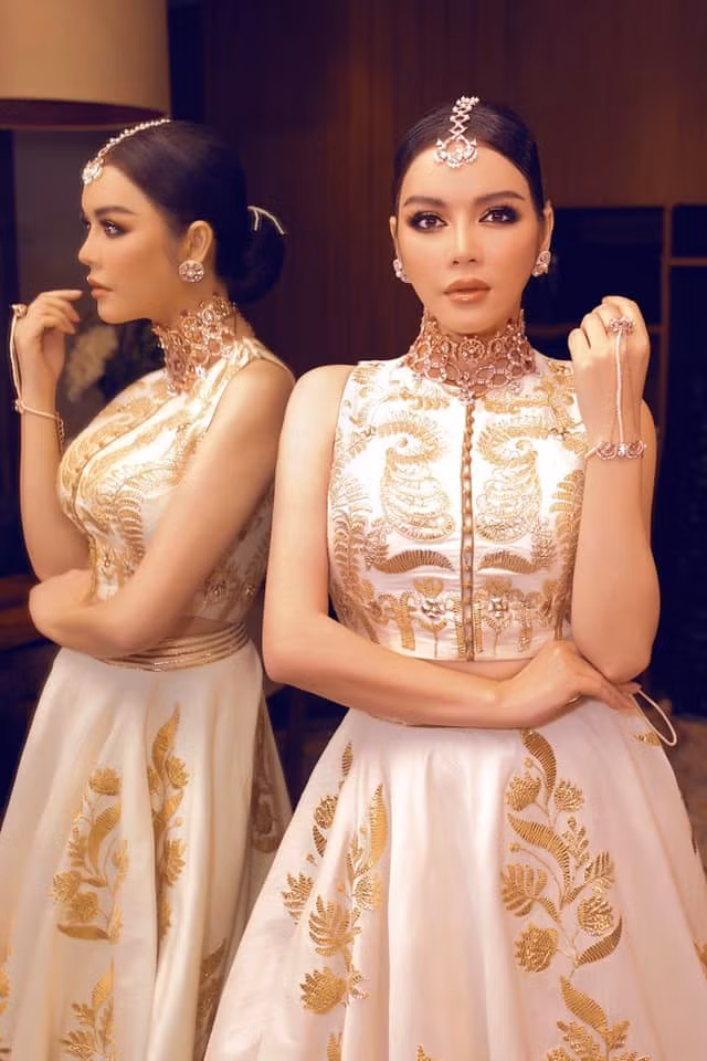 ... cùng trang phục được đích thân ngài tỉ phú cho nhà thiết kế Ấn Độ đặt may riêng theo số đo của cô, chiếc đầm được làm thủ công trong 2 tháng với các đường chỉ vàng được đính kết tỉ mỉ, làm tăng thêm nét sang trọng, quyền quý, cổ điển vốn có của Lý Nhã Kỳ.