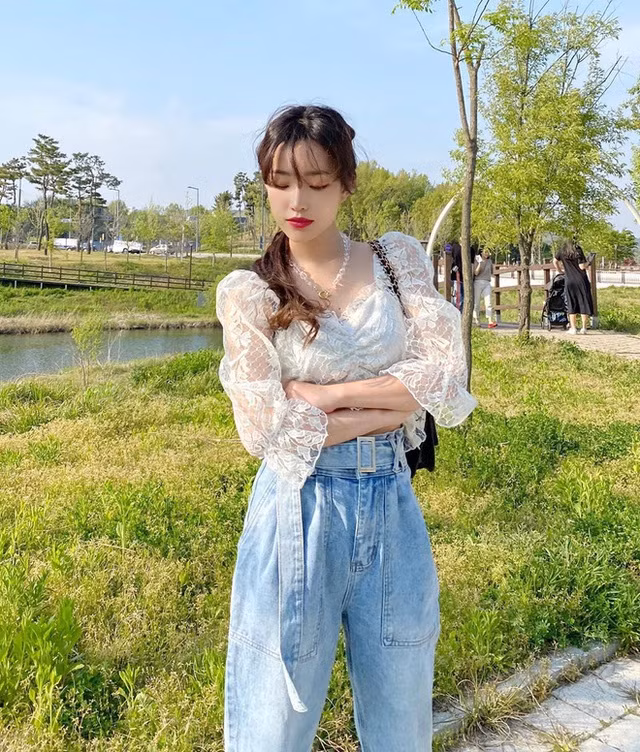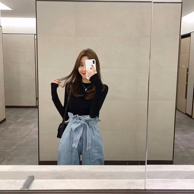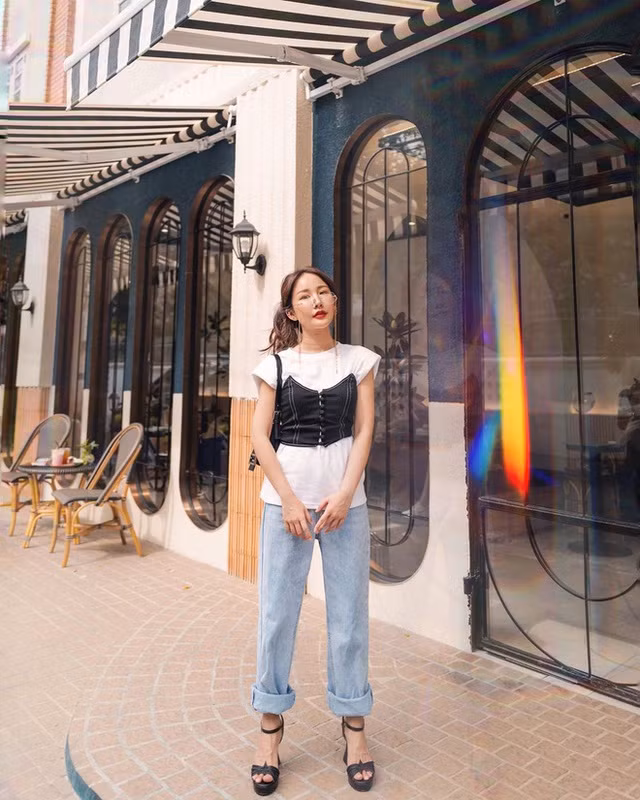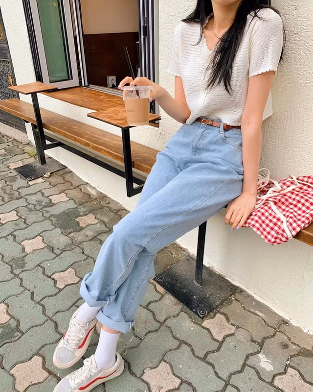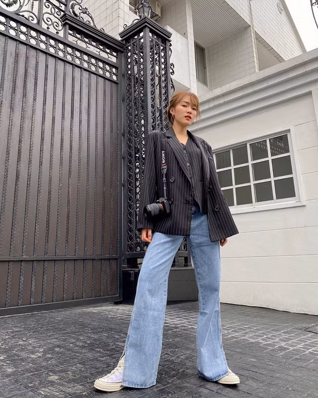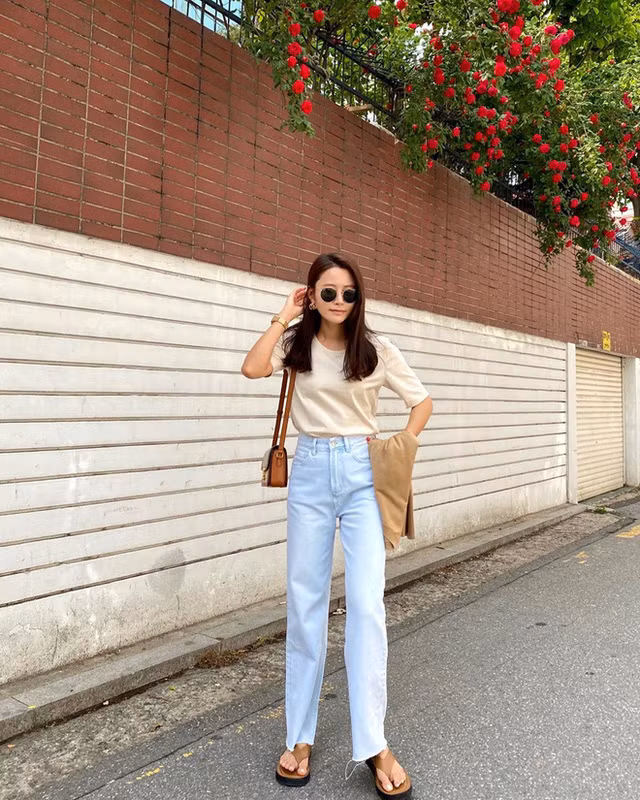 Bên cạnh quần jeans trắng thì quần jeans xanh sáng màu cũng "lên ngôi". Set đồ của bạn chỉ cần có sự góp mặt của item này thì đã "auto" bụi phủi, sang xịn hơn vài nấc.