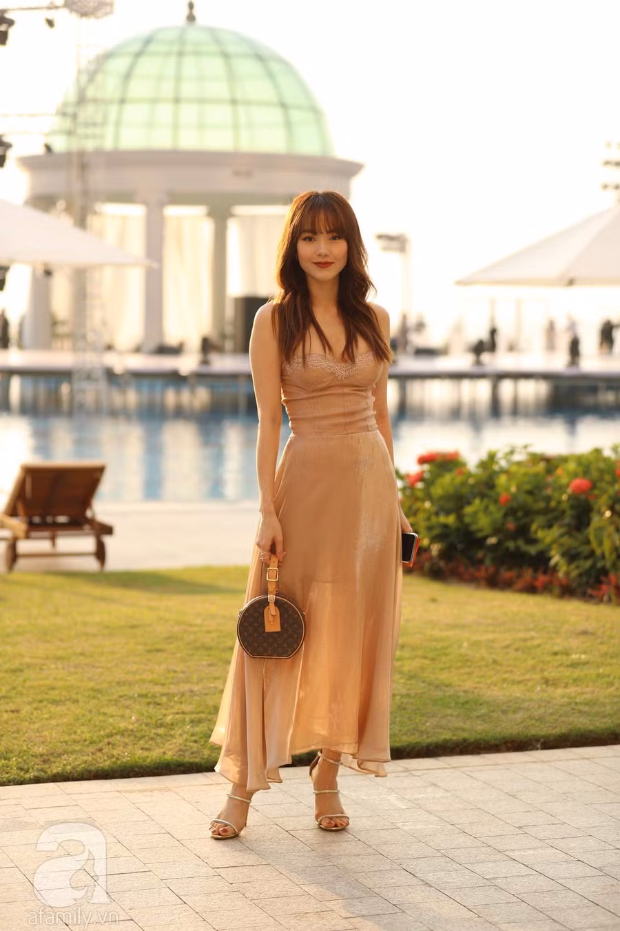 Váy hai dây hay váy quây thường gắn liền với vẻ phóng khoáng, gợi cảm nhưng nếu mang phom dáng midi, kiểu váy này sẽ đạt 10 điểm thanh lịch.
