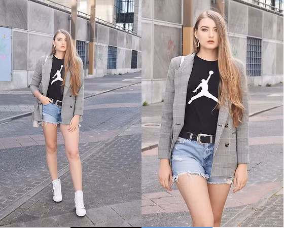 Quần shorts cũng có khả năng giúp chân bạn thon dài hơn đáng kể. Nhìn vào hình ảnh thử nghiệm của cô nàng dưới đây dễ thấy nếu muốn chân trông dài hơn, bạn nên chọn dáng quần cạp cao dáng quần vừa vặn, phần ống hơi xuông nhẹ sẽ giúp tạo hiệu ứng thị giác tốt nhất.