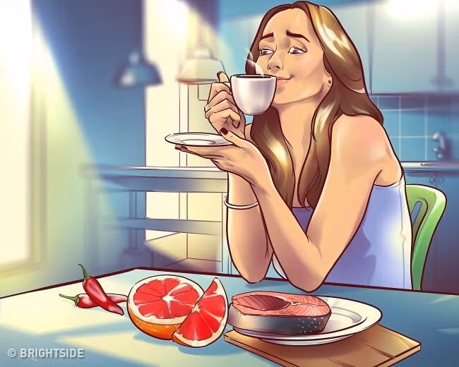 Bạn không phải loại bỏ những thực phẩm thông thường trong bữa ăn hàng ngày của mình. Chỉ cần đa dạng thực đơn của bạn với cá hồi, trứng, các loại hạt, dầu ô liu, ớt và trà xanh. Chúng sẽ giúp tăng cường sự trao đổi chất và đốt cháy chất béo hiệu quả hơn. Ngay cả hương thơm của cam quýt hay bạc hà cũng có thể làm giảm sự thèm ăn của bạn, do đó đừng bỏ qua chúng.