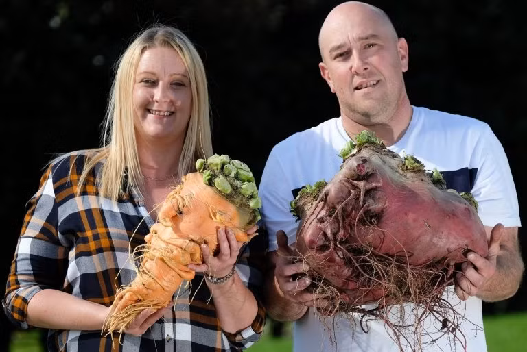Laura và Chris Marriott với củ cà rốt nặng 3,8kg và củ cải đường nặng 17,840kg (Nguồn: Getty Images).