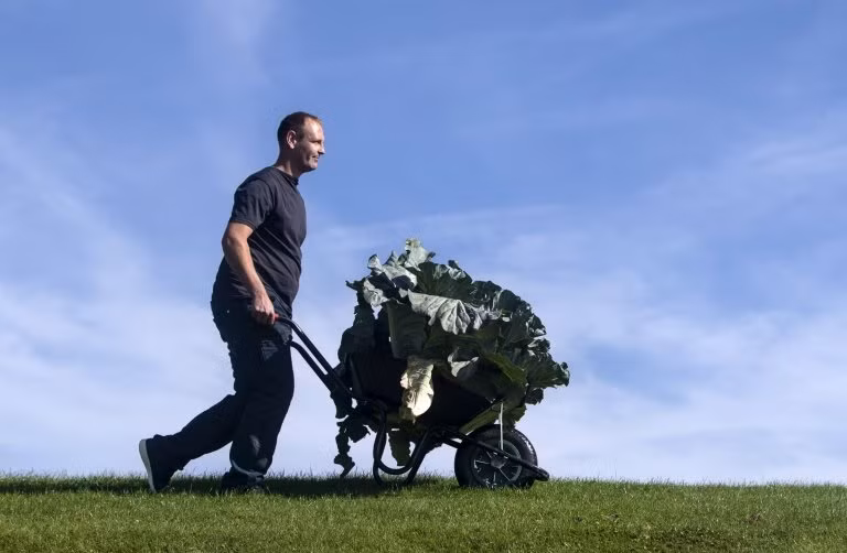 Bắp cải khổng lồ của Craig Pearson nặng đến 27,4 kg và phải nhờ đến sự trợ giúp của xe đẩy. (Nguồn: PA Wire).