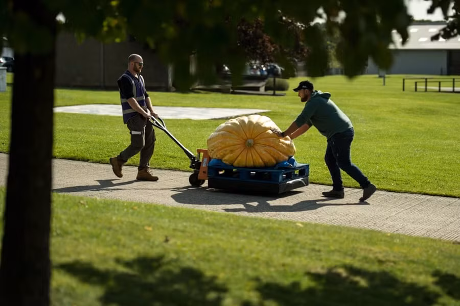 Richard Mann cùng một nhân viên trong ban tổ chức di chuyển quả bí ngô nặng kỷ lục trong cuộc thi năm nay. (Nguồn: AFP).