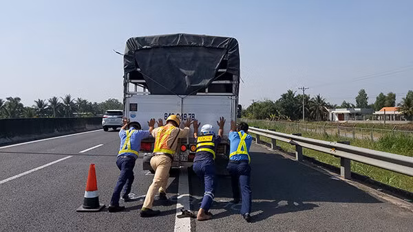 Lực lượng chức năng phải đẩy xe vào làn dừng khẩn cấp để tránh tai nạn đáng tiếc xảy ra. Ảnh CAND.