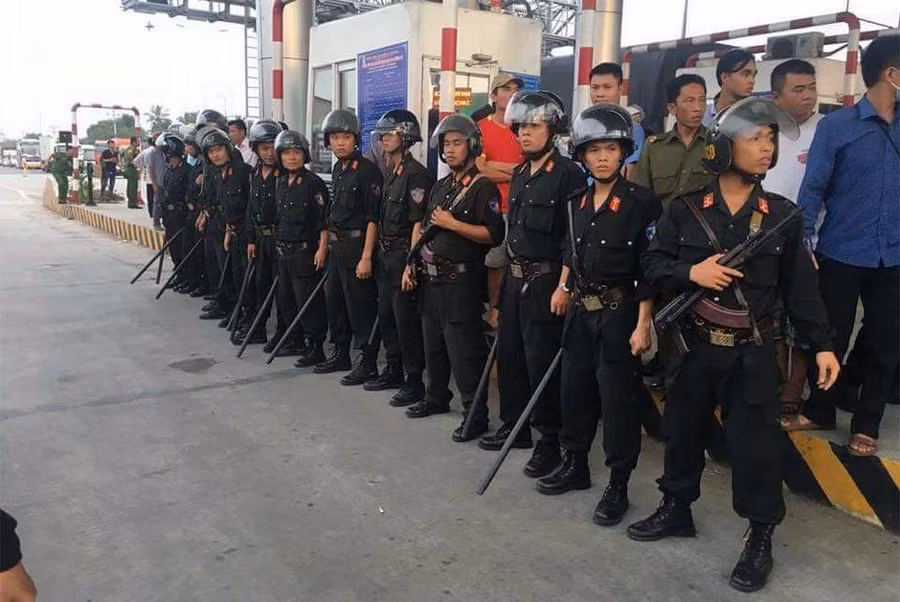 Cảnh sát cơ động đảm bảo an ninh trật tự tại BOT Cai Lậy.