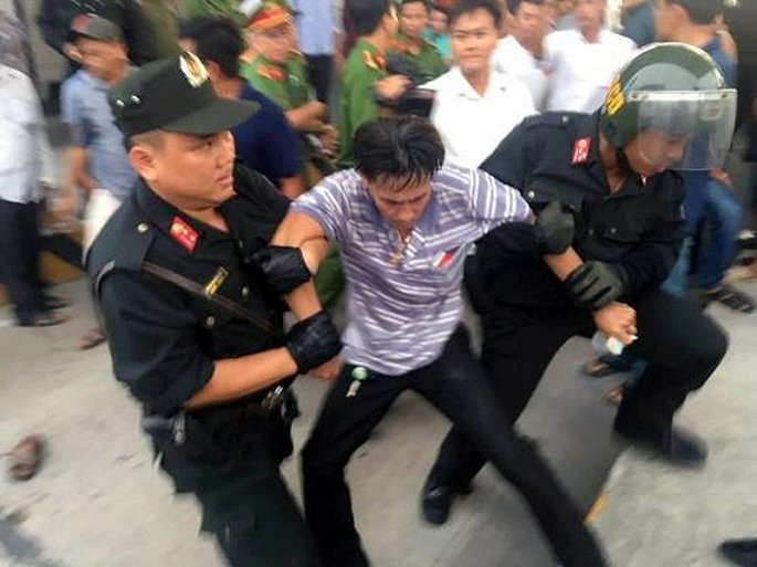 Tài xế Trịnh Hồng Phương bị CSCĐ huyện Cai Lậy áp giải ra khỏi khu vực trạm BOT Cai Lậy.