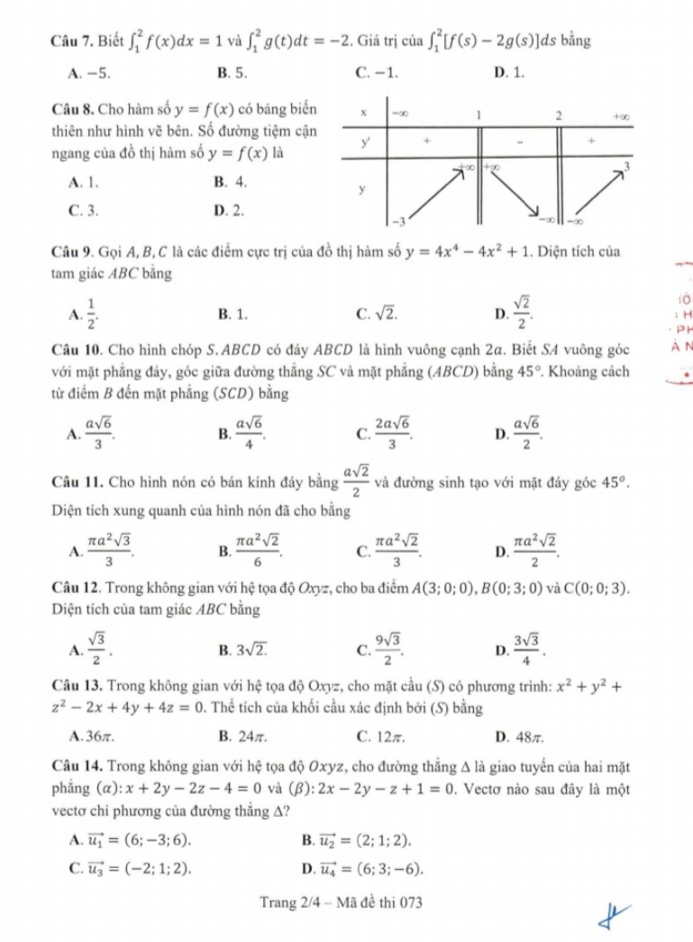Chương nguyên hàm, tích phân và ứng dụng có 1 câu (câu 7) nhưng đơn giản không khó khăn gì.
