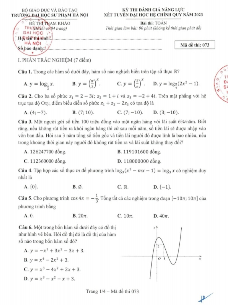 Dưới đây là Đề thi tham khảo môn Toán Kỳ thi đánh giá năng lực của Trường ĐH Sư phạm Hà Nội năm 2023.
