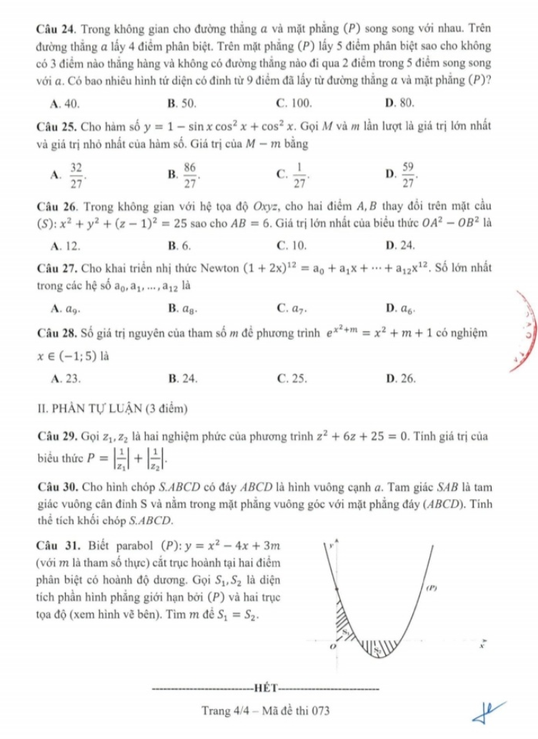 Đối với phần tự luận gồm có 3 câu. Trong đó, câu 29 là giải phương bậc hai về số phức nhưng hệ số thực rồi thay vào biểu thức thì quá dễ, câu 30 tính thể tích khối chóp vẽ hình ra là làm được liền học sinh cũng làm được và câu 31 là ứng dụng tích phân để tính diện tích hình phẳng, có phần lắt léo nên học sinh cần tư duy mới làm được nhưng không đến nỗi đánh đố.