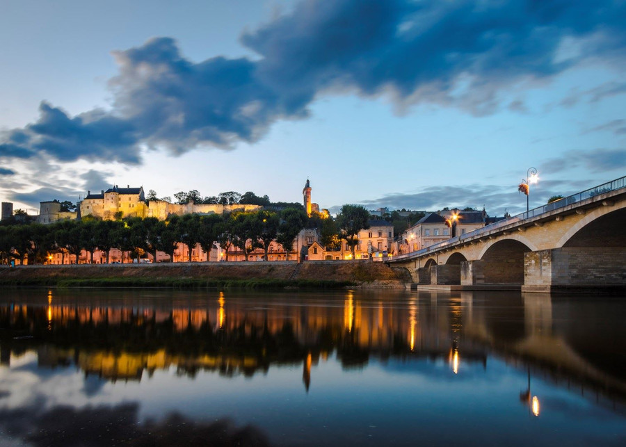 Thị trấn cổ nằm êm đềm giữa thung lũng sông Loire cạnh hai bờ sống Vienne dài nhất tại Pháp. Là địa danh có cội nguồn lịch sử lâu đời, với tòa lâu đài cổ nơi Vua Henry II (1133-1189) của nước Anh cùng Hoàng hậu Alienor từng sinh sống.