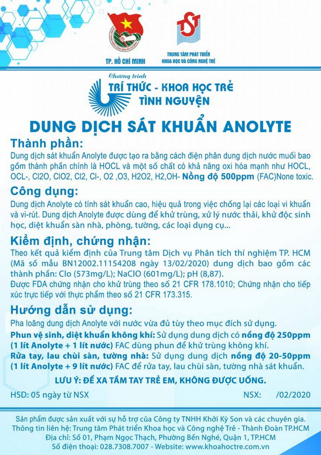 Trước bối cảnh dịch bệnh Covid – 19 đang bùng phát, Trung tâm Phát triển KH&CN Trẻ – Thành đoàn TP.HCM phối hợp cùng đội ngũ các nhà khoa học, chuyên gia nghiên cứu thực hiện quy trình Công nghệ điện phân nước Envirolyte. Đây là quá trình điện phân dung dịch muối ăn (NaCl) di chuyển qua điện cực được thiết kế đặc biệt để tạo ra dung dịch Anolyte có khả năng kháng khuẩn cao. Sản phẩm dùng để phun sát trùng chống lại các loại vi khuẩn và virus; khử độc sinh học, diệt khuẩn sàn nhà, phòng học, rửa tay hoặc làm sạch thực phẩm.