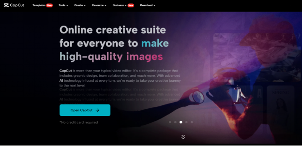 CapCut Creative Suite cung cấp cho người dùng trình chỉnh sửa ảnh trực tuyến để chỉnh sửa ảnh một cách ấn tượng nhất. Vì vậy, trình chỉnh sửa này mang đến nhiều tính năng cao cấp miễn phí, tối ưu hóa màu sắc, bộ lọc, hiệu ứng, xóa/thêm nền,... Ngoài ra còn có các lựa chọn để thêm vào ảnh như sử dụng biểu mẫu và nhãn dán để làm nổi bật hình ảnh đó. Người dùng cũng có thể điều chỉnh màu sắc, độ nét và nhiều tính năng quan trọng khác của nội dung hình ảnh.