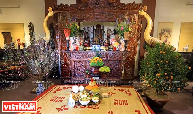 Đúng giao thừa, trên bàn thờ gia tiên thơm hương khói, đèn nến lung linh, chắp tay cung kính trước bàn thờ tổ tiên.