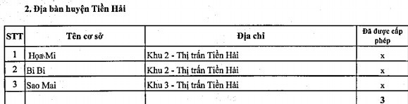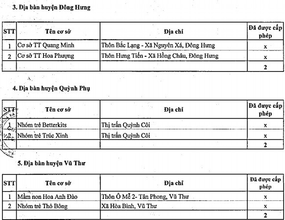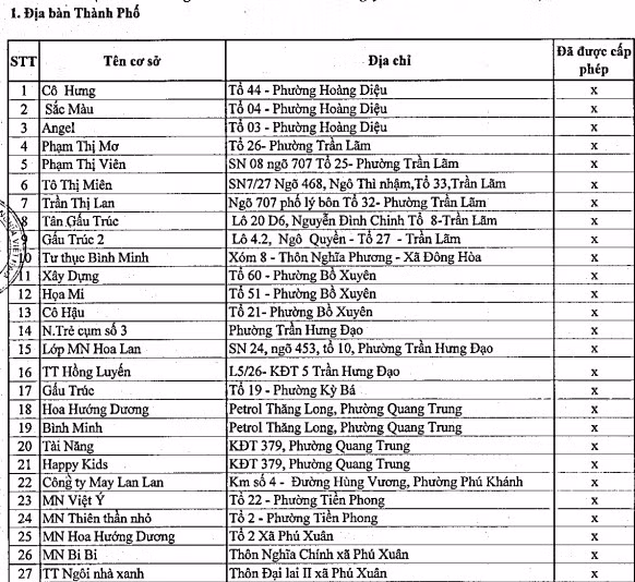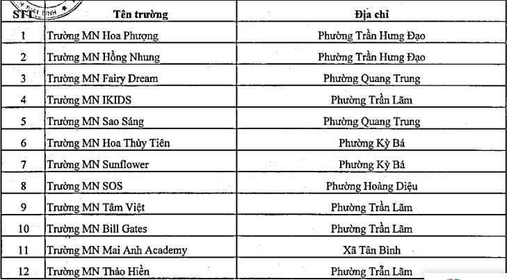 Danh sách gồm 12 trường mầm non tư thục đã được cấp phép hoạt động, cụ thể: