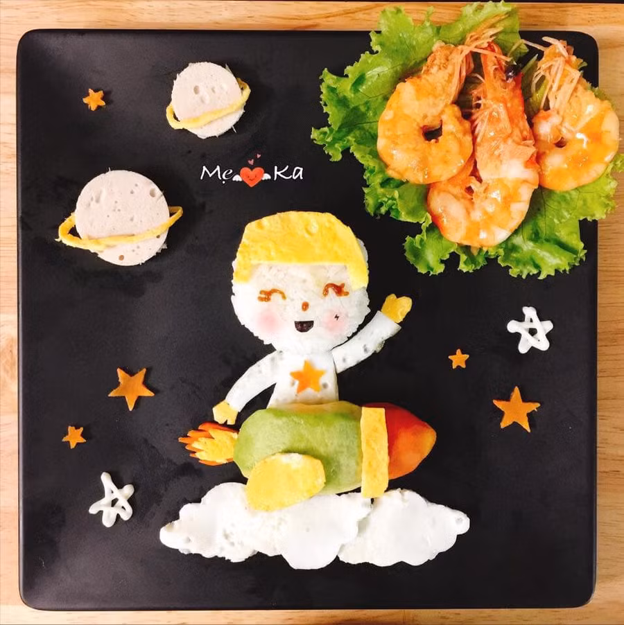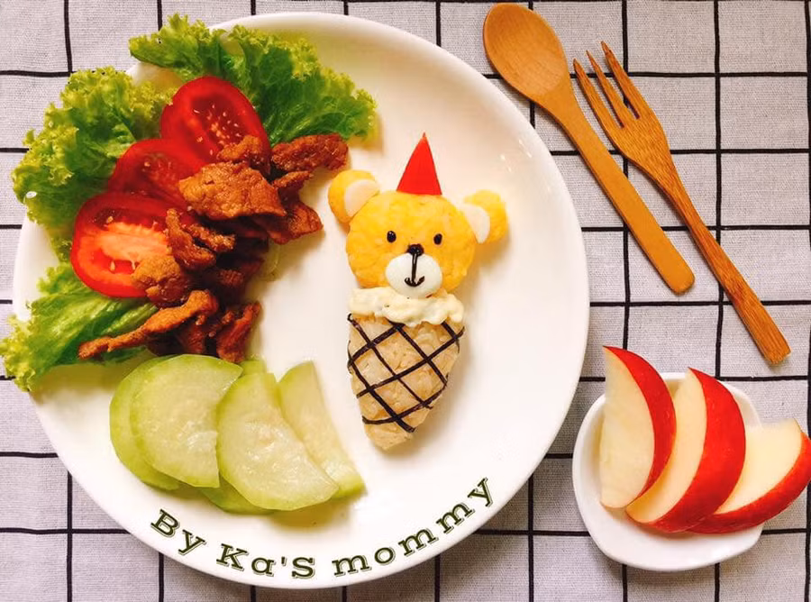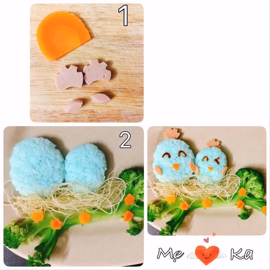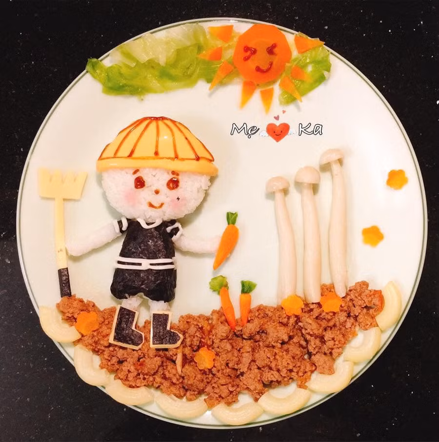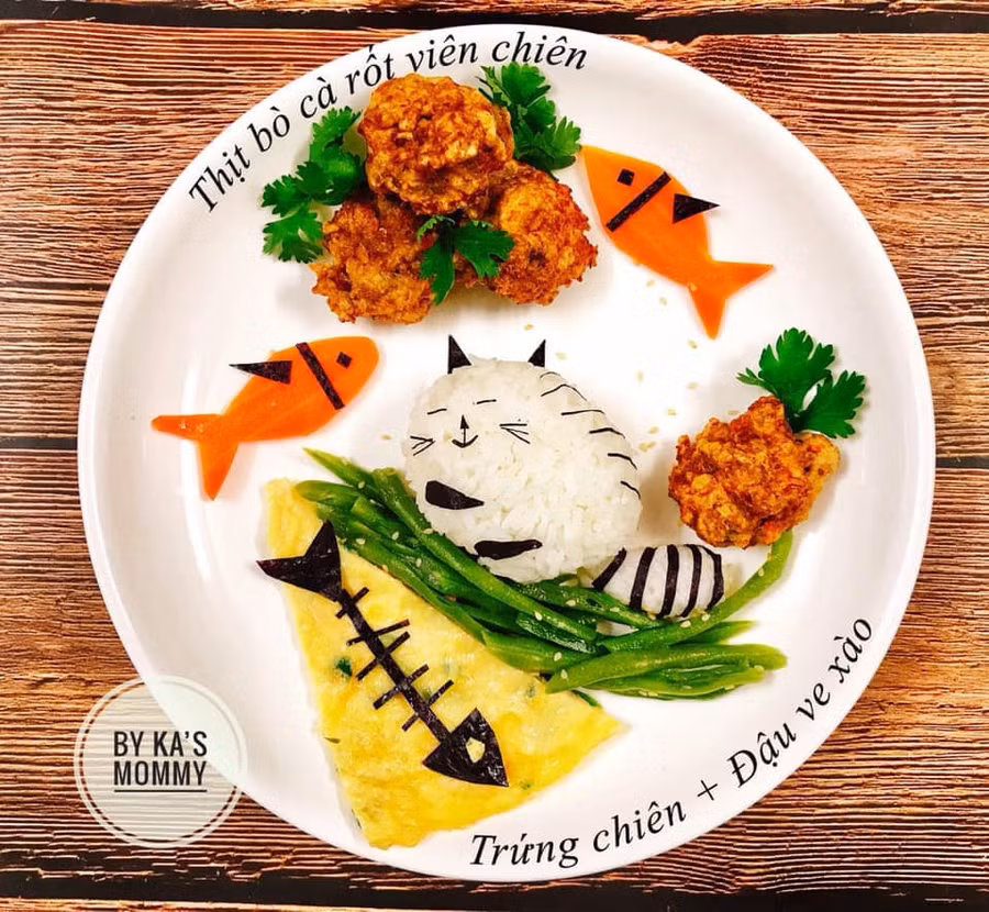 Mẹ bé Ka nói thêm: "Mình nghĩ khó nhất ở phần tạo hình cho cơm thôi, còn lại việc sắp xếp bối cảnh cho bữa ăn hoặc các đồ trang trí xung quanh sẽ phụ thuộc vào sự sáng tạo của mẹ và ý tưởng phong phú của bé. Các mẹ cũng có thể làm theo yêu cầu của bé để bé thêm hào hứng với bữa ăn".
