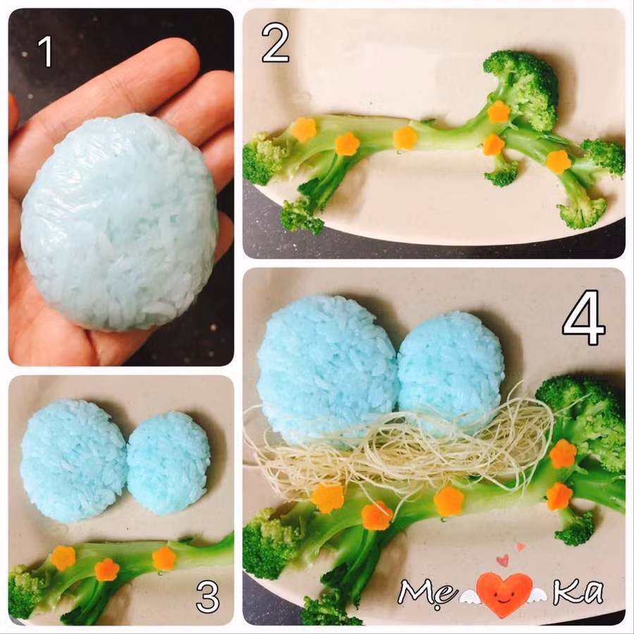 Bà mẹ 1 con chia sẻ: "Màu sắc của cơm sẽ được lấy màu tự nhiên như vàng của trứng hoặc nghệ, xanh lá của rau, xanh da trời từ hoa đậu biếc, cam từ cà rốt, nâu từ tương đen hoặc xì dầu, tím từ bắp cải tím, hồng đỏ từ thanh long đỏ hoặc củ dền. Một số cách tạo màu cho cơm khá dễ làm như nấu chín, trộn với nước rau củ xay rồi cho lên bếp đảo đến khi có màu là được.