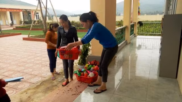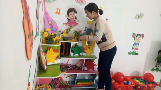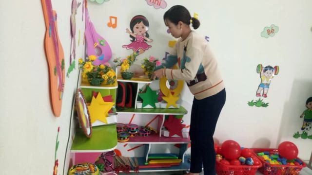 | Giáo viên Trường Mầm non Cẩm Sơn (thị trấn Phong Sơn, Cẩm Thủy) vệ sinh đồ chơi trong lớp cho học sinh |