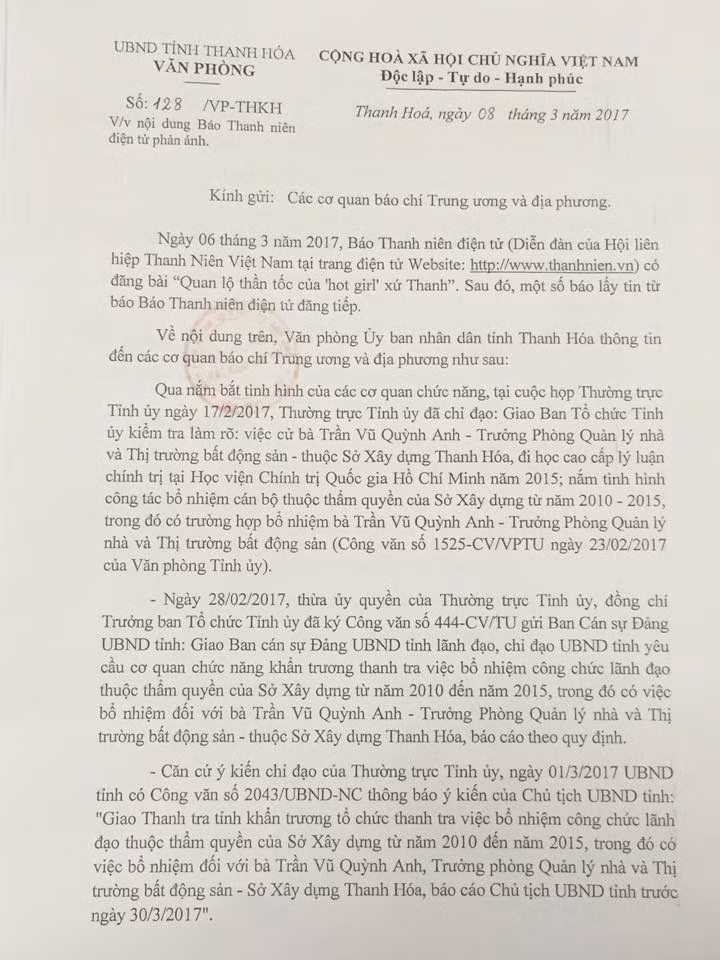 Theo đó, qua nắm bắt tình hình các cơ quan chức năng tại cuộc họp thường trực Tỉnh ủy ngày 17/2/2017, thường trực Tỉnh ủy đã chỉ đạo Ban tổ chức Tỉnh ủy kiểm tra làm rõ việc cử bà Trần Vũ Quỳnh Anh - Trưởng phòng Quản lý nhà và Thị trường bất động sản, thuộc Sở Xây Dựng Thanh Hóa đi học cao cấp lý luận chính trị tại Học viện Hành chính Quốc gia Hồ Chí Minh năm 2015; nắm tình hình công tác bổ nhiệm cán bộ thuộc thẩm quyền của Sở Xây dựng từ năm 2010-2015, trong đó có trường hợp bổ nhiệm bà Trần Vũ Quỳnh Anh - Trưởng phòng Quản lý nhà và Thị trường bất động sản.