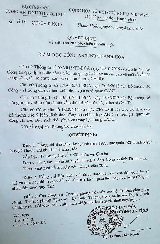 Ngày 29/8/2018, trung úy Bùi Đức Anh – cán bộ Công an huyện Thạch Thành nhận được quyết định về việc cho cán bộ, chiến sỹ xuất ngũ số 636/QĐ-CAT-PX13 ngày 2/8/2018 của giám đốc Công an tỉnh Thanh Hóa, do đại tá Đào Đức Minh - Phó giám đốc Công an tỉnh Thanh Hóa ký. Trong quyết định trên ghi các căn cứ: Thông tư 55/2015/TT-BCA, thông tư 17/2016/TT-BCA, thông tư 53/2012/TT-BCA, căn cứ công văn 1828/X13-P6 ngày 23/7/2018 của Cục tổ chức cán bộ; xét đề nghị của Phòng tổ chức cán bộ...Nhưng quyết định không ghi rõ lý do xuất ngũ của trung úy Bùi Đức Anh.