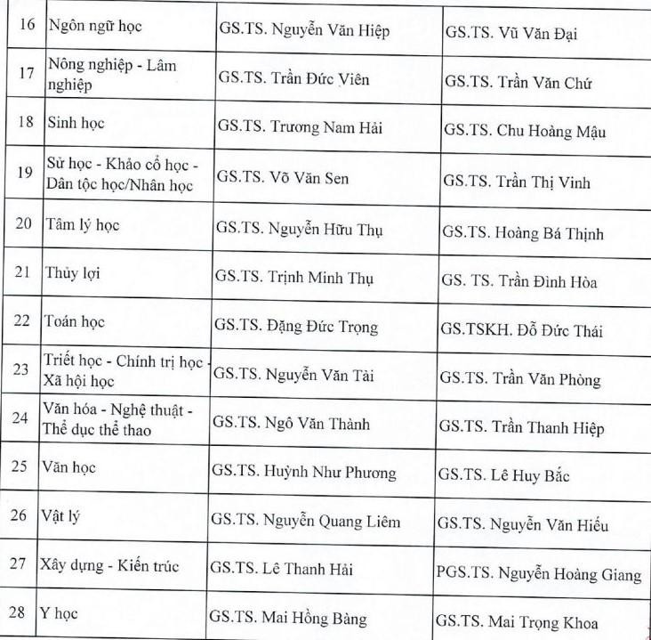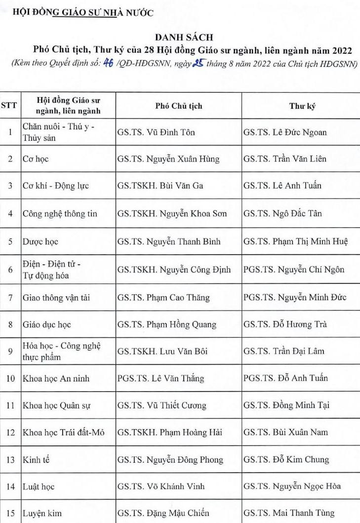 Cùng với đó, Chủ tịch Hội đồng Giáo sư nhà nước cũng đã quyết định bổ nhiệm chức danh Phó Chủ tịch, Thư ký của 28 Hội đồng Giáo sư ngành, liên ngành. Cụ thể như sau: