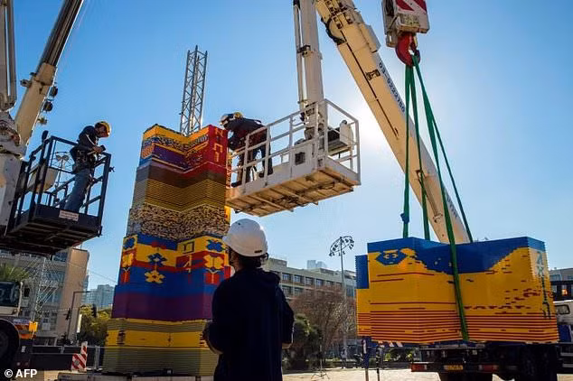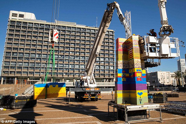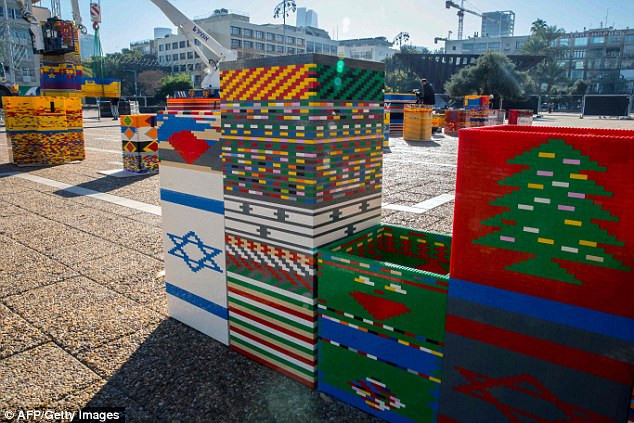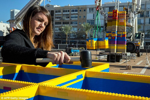 Những miếng ghép lego đã được dựng lên ở Quảng trường Rabin. Theo sách Guinness, kỷ lục trước được lập năm 2015 khi một tháp Lego ở Italia cao 35,05 mét cho triển lãm thế giới Milan.