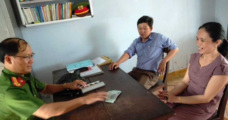Khi Công an xã vừa tiếp nhận số tiền thì cũng đúng lúc nghe người dân loan tin có chị Trần Thị Lài quê ở thôn Trằm Ngang vào Nam làm thuê từ lâu, nay gom được 20 triệu đồng về lo tiền học cho các con thì không may bị mất. Sau khi kiểm tra, đối chiếu thì trùng khớp với số tiền thầy Chi đã nhặt được. Vì vậy, Công an xã Quảng Thái đã làm thủ tục trao trả tiền cho chị Lài.