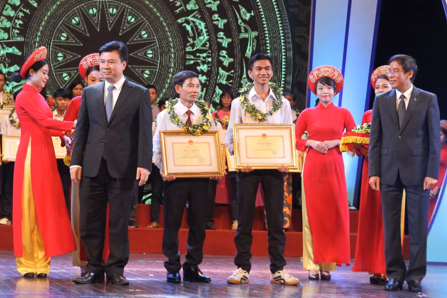 Thầy Khởi nhận bằng khen của Bộ trưởng Bộ GD&ĐT tại Lễ tuyên dương gương người tốt, việc tốt, đổi mới sáng tạo trong dạy và học năm học 2016 - 2017.