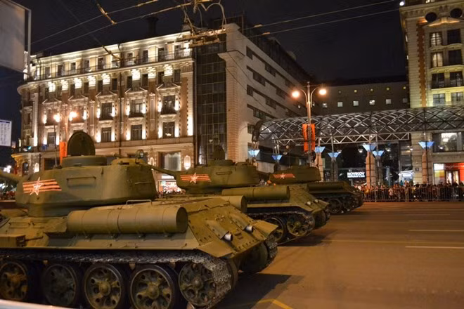 Đoàn xe quân sự của quân đội Nga liên tiếp nối nhau đổ về trung tâm thủ đô Moscow nơi gần Quảng Trường Đỏ để chuẩn bị cho lễ diễu binh lớn nhất trong năm của Nga mừng ngày chiến thắng phát xít 9/5/2015.