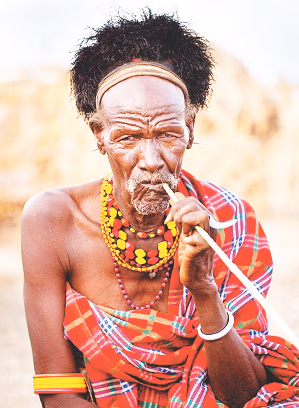 Nam nữ nhiều khi còn đeo vòng môi, tức là một cái ghim vào môi, có đầu nhọn cắm qua thịt. Hiện nay, các cụ bà vẫn đeo vòng này ở môi, còn cụ ông thì đội một búi tóc bằng đất đính lông đà điểu để thể hiện đã già.