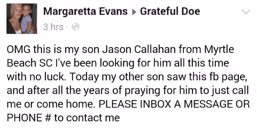 Hóa ra, thi thể không xác định này là con trai của bà Jason Callahan, người đã mất tích vào khoảng thời gian đó. Gia đình khi đó cho rằng người con trai đã bỏ nhà đi. Cam kết của gia đình bà Jasson Callahan sau đó cũng được khẳng định bằng xét nghiệm DNA.