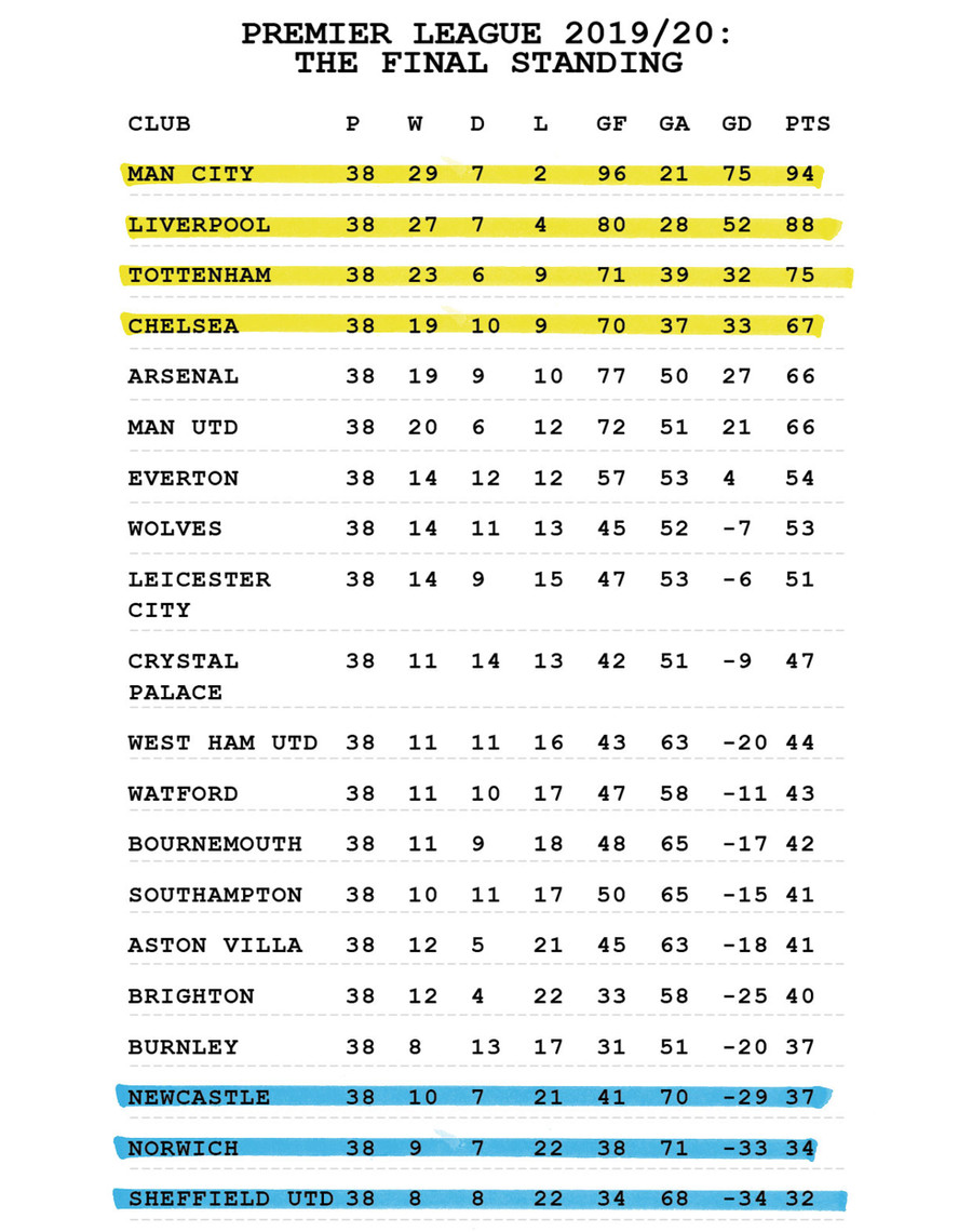 Ở đầu kia của bảng xếp hạng, Sheffield United, Norwich và Newcastle là những cái tên được dự báo sẽ phải chia tay với sân khấu Premier League. Một mùa hè sôi động với nhiều bản hợp đồng mới cũng sẽ chỉ giúp Aston Villa có được vị trí thứ 15, hơn nhóm xuống hạng 4 điểm. Dù được đánh giá cao, nhưng West Ham United, Crystal Palace và đặc biệt là Leicester City cũng sẽ chỉ có được những vị trí ở giữa bảng xếp hạng. Trong khi đó, chú ngựa ô của mùa giải năm ngoái - Wolverhampton, sẽ tiếp tục cạnh tranh trực tiếp với Everton cho tấm vé cuối cùng tham dự Cúp Châu Âu mùa giải năm sau.
