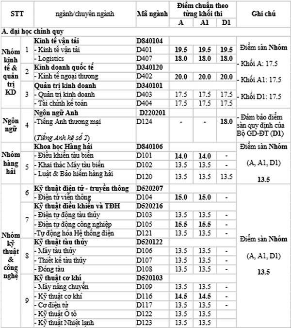 Các thí sinh dự thi khối A, A1 các ngành thuộc Nhóm Kinh tế & QTKD có tổng điểm (kể cả ưu tiên) từ 13.5 đến 17.0 điểm được đăng ký xét tuyển vào các chuyên ngành còn thiếu của Nhóm Hàng hải và Nhóm Kỹ thuật & Công nghệ.