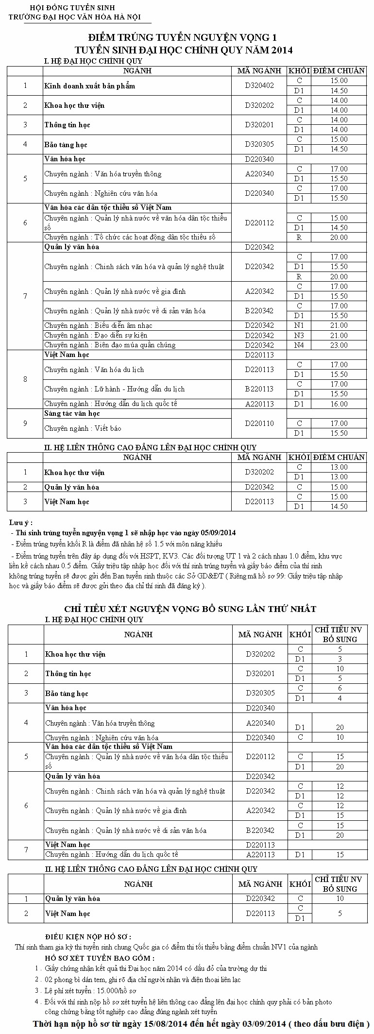 Trường ĐH Văn hóa Hà Nội thông báo điểm trúng tuyển nguyện vọng 1 tuyển sinh đại học năm 2014 và chỉ tiêu xét NV bổ sung lần 1: