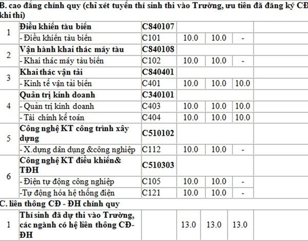Trường Đại học Hàng hải Việt Nam thông báo điểm trúng tuyển vào đại học và cao đẳng hệ chính quy năm 2014 các khối A, A1 và D1 đối với các thí sinh đã dự thi vào Trường thuộc khu vực 3, đối tượng 10 (diện không ưu tiên) như sau: