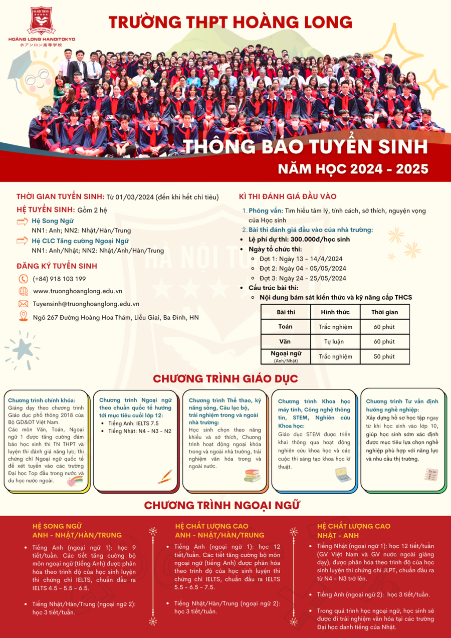 Bên cạnh đó, Trường THPT Hoàng Long cũng áp dụng xét tuyển thẳng với học sinh đạt thành tích học sinh giỏi hoặc có chứng chỉ ngoại ngữ Quốc tế (IELTS/JLPT). Thời gian nhận hồ sơ và thông báo kết quả chính thức theo 3 đợt (đợt 1, từ nay đến 3/5/2024; đợt 2, từ 4 -31/5/2024 và đợt 3, từ 1/6 - 15/7/2024).