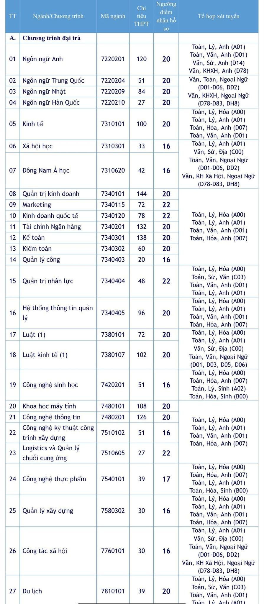 Ngành có điểm nhận hồ sơ cao nhất ở mức 22 điểm gồm: Ngôn ngữ Anh, Marketing, Kinh doanh quốc tế, Quản trị nhân lực, Logistics và quản lý chuỗi cung ứng....