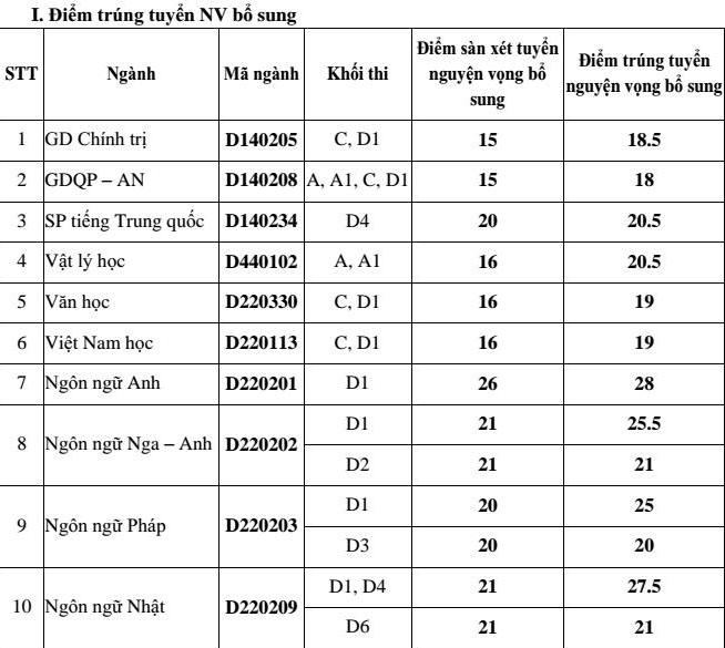 Điểm chuẩn các ngành chuyên ngữ, điểm thi môn ngoại ngữ hệ số 2. Thí sinh trúng tuyển nguyện vọng 2 sẽ nhập học vào ngày 11/9.