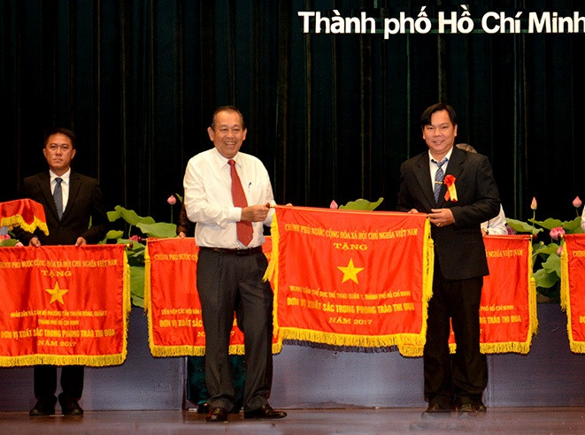 Tại buổi lễ, Phó Thủ tướng Thường trực Chính phủ Trương Hòa Bình đã trao tặng thưởng Cờ thi đua của Chính phủ năm 2017 cho 12 tập thể tiêu biểu.