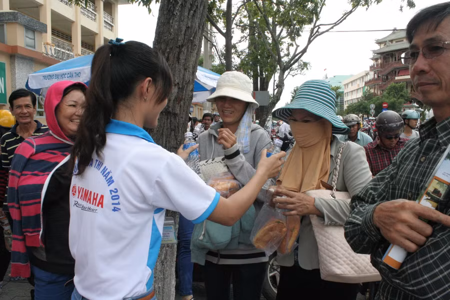 Năm nay các địa điểm thi ở Cần Thơ công tác tiếp sức thí sinh và người thân được tổ chức chu đáo. Từ sáng sớm nhiều thanh niên tình nguyện và mạnh thường quân chuẩn bị hàng ngàn suất cơm, nước uống, bánh mì miễn phí đem đến tận trường thi phát cho thí sinh.