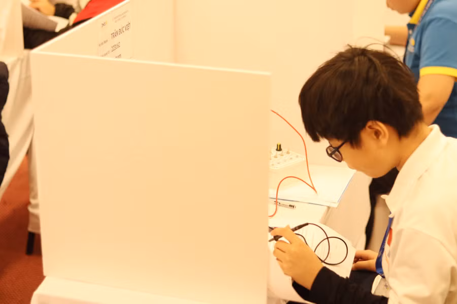 Trong phòng thi, thí sinh được phát phiếu trả lời và dụng cụ thực hành. Trước khi các thí sinh làm bài, Ban tổ chức đã hướng dẫn chi tiết cách điền thông tin và cách thức làm bài. Các em cũng được thực hiện vài động tác khởi động nhẹ để giải phóng cơ thể và có tâm lý thoải mái nhất cho cuộc thi.