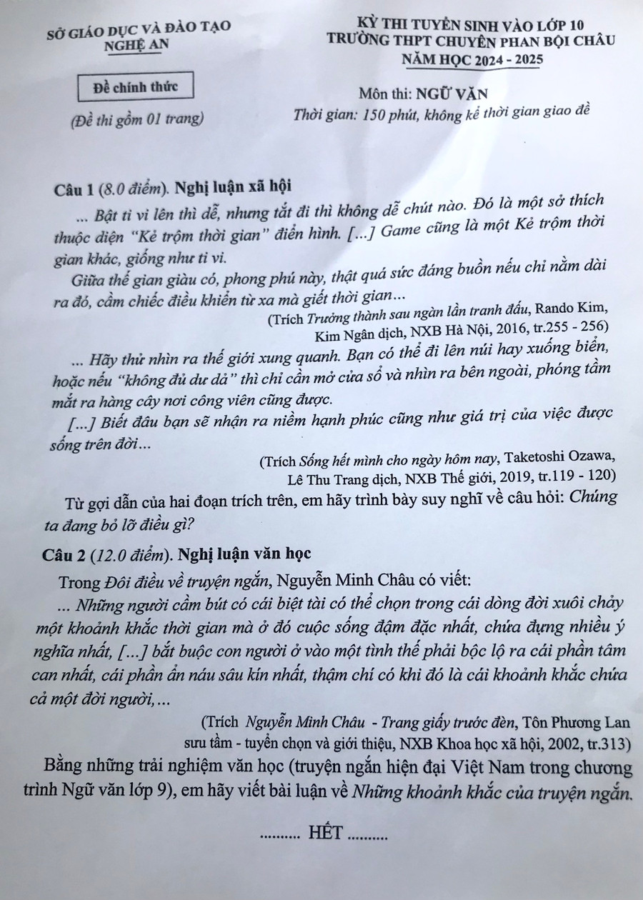 Còn em Tuấn Dũng, học sinh Trường THCS Đặng Thai Mai (TP Vinh) cho biết: Em khá thích đề này, em viết được 15 trang và em hi vọng mình sẽ làm được điểm tốt. Bài Nghị Luận xã hội với yêu cầu “Suy nghĩ về câu hỏi “Chúng ta đang bỏ lỡ điều gì” em khá thích thú. Cá nhân em cho rằng, chúng ta đang chạy theo nhiều điều không thiết thực hoặc quá xa vời, mà không nhận ra những khoảnh khắc ý nghĩa bên gia đình, bạn bè để rồi bỏ lỡ.