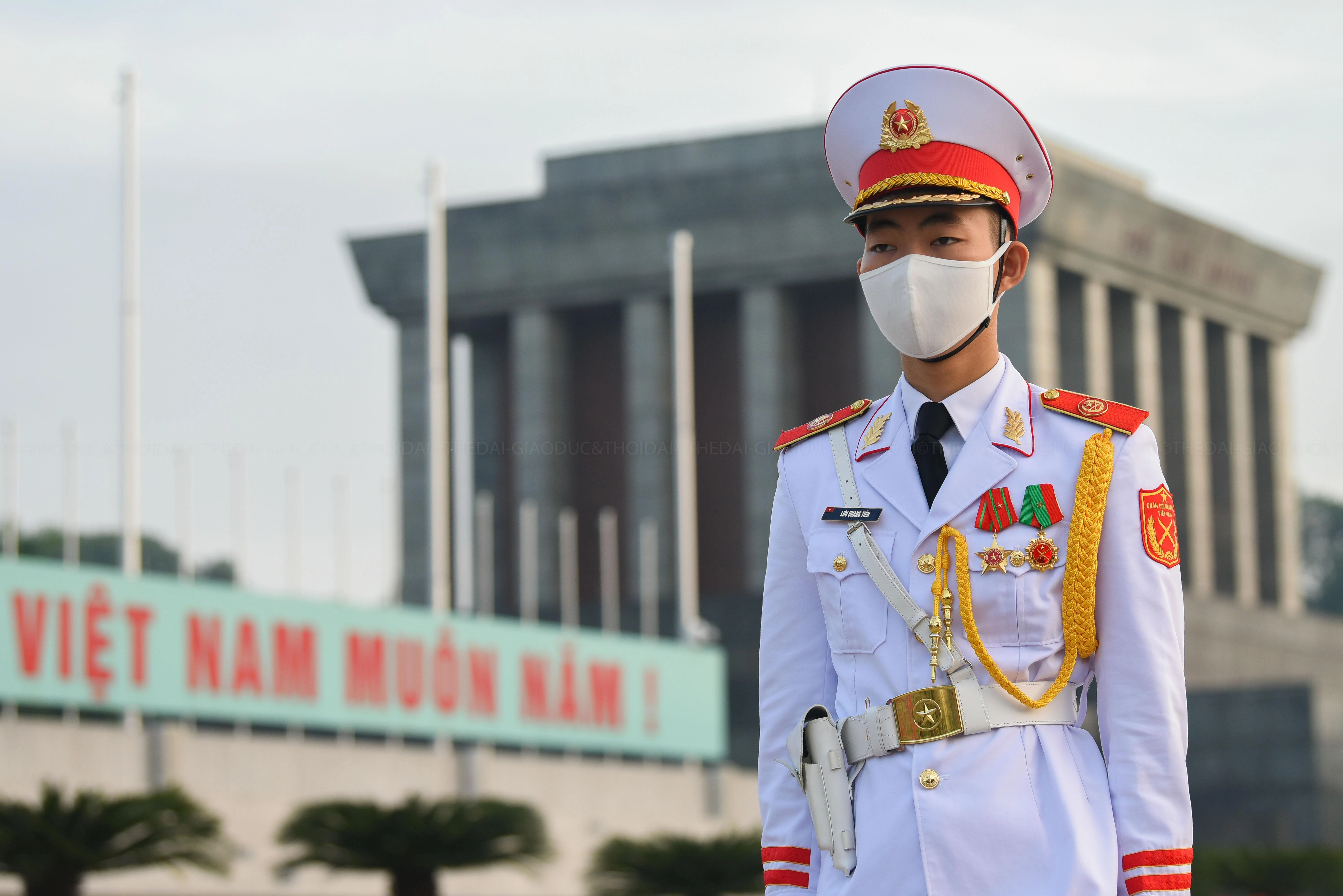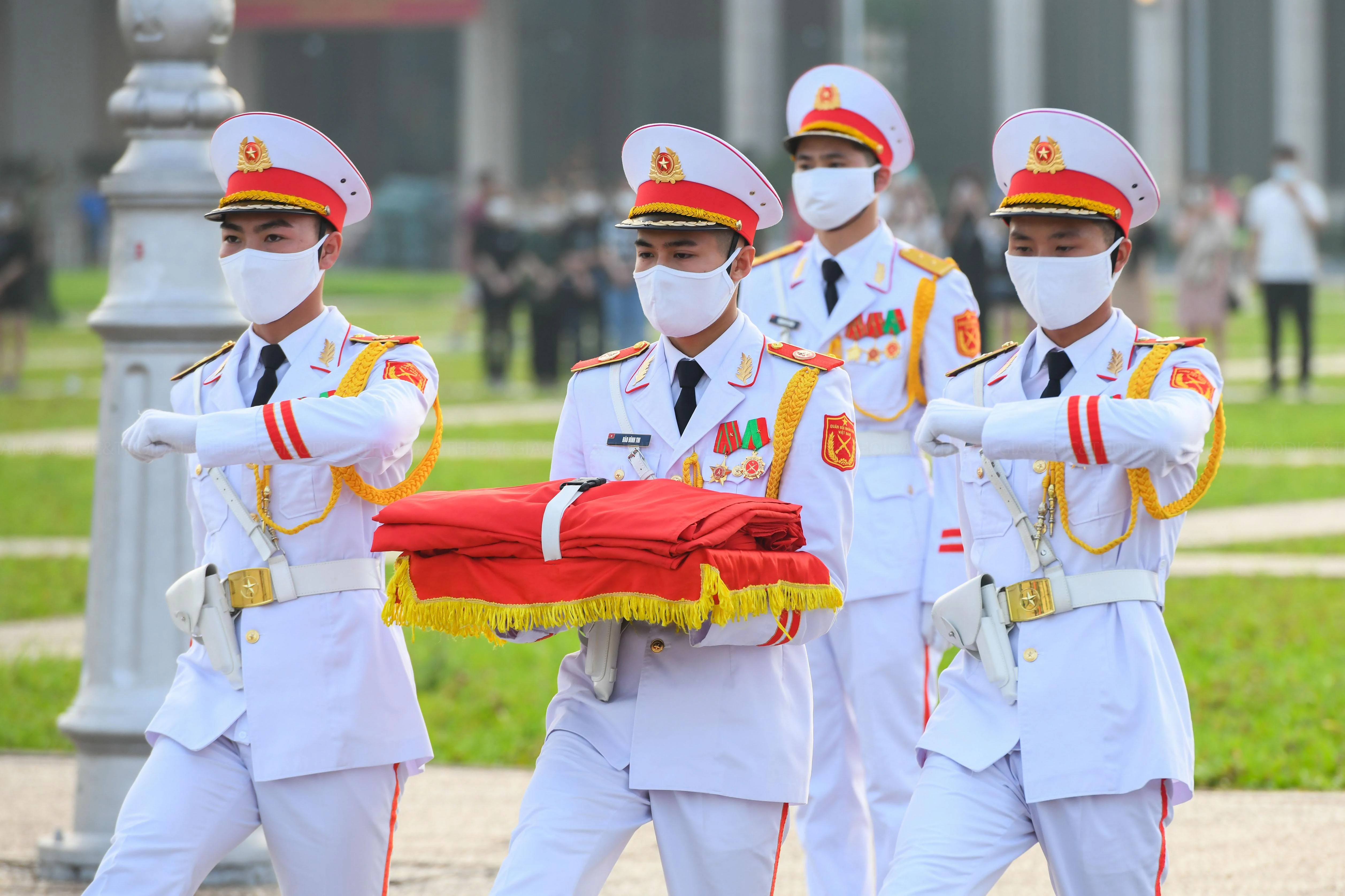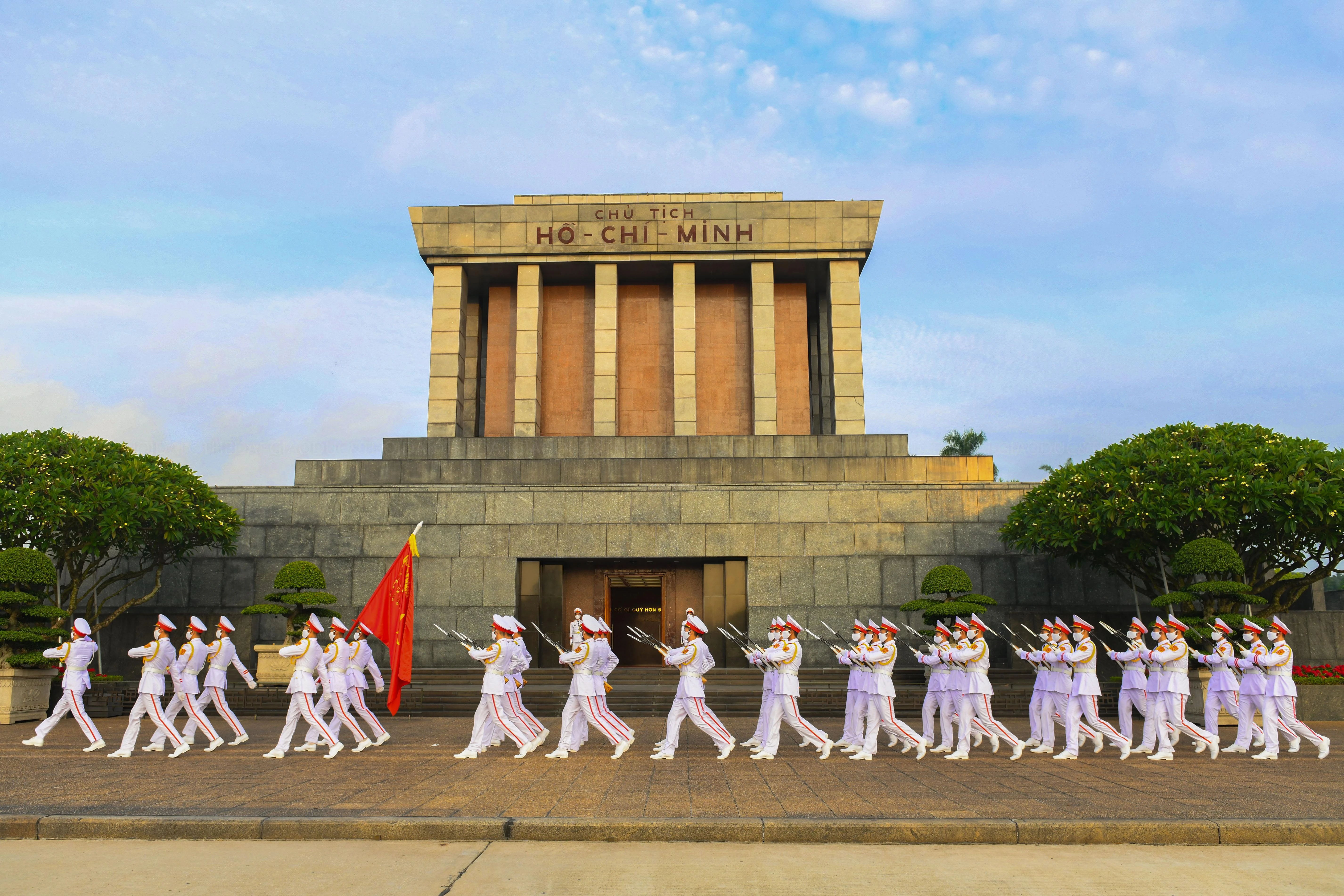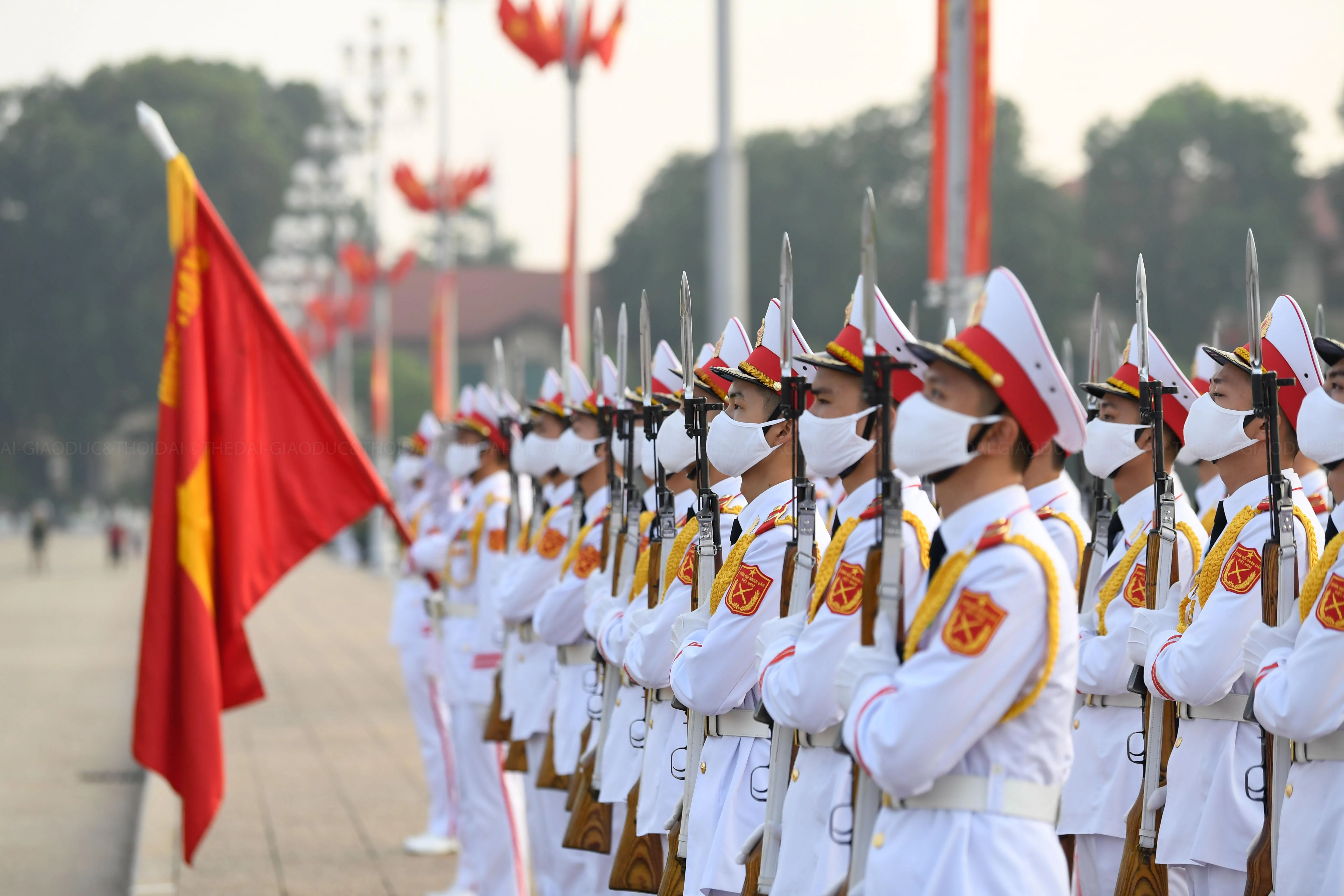 | 5h50, các chiến sĩ thuộc Đoàn 275 (Bộ Tư lệnh bảo vệ Lăng Chủ tịch Hồ Chí Minh) thực hiện lễ thượng cờ tại Quảng trường Ba Đình. |